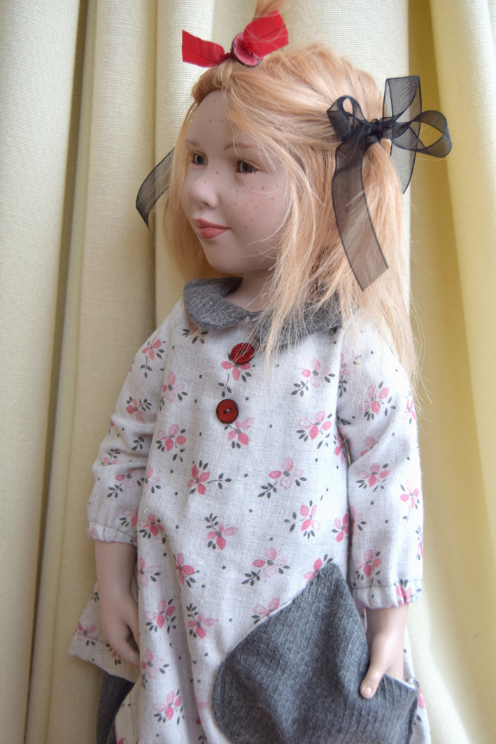 Her dress is not striking, but the construction of the grey pocket and its counterpart on the other side is . |